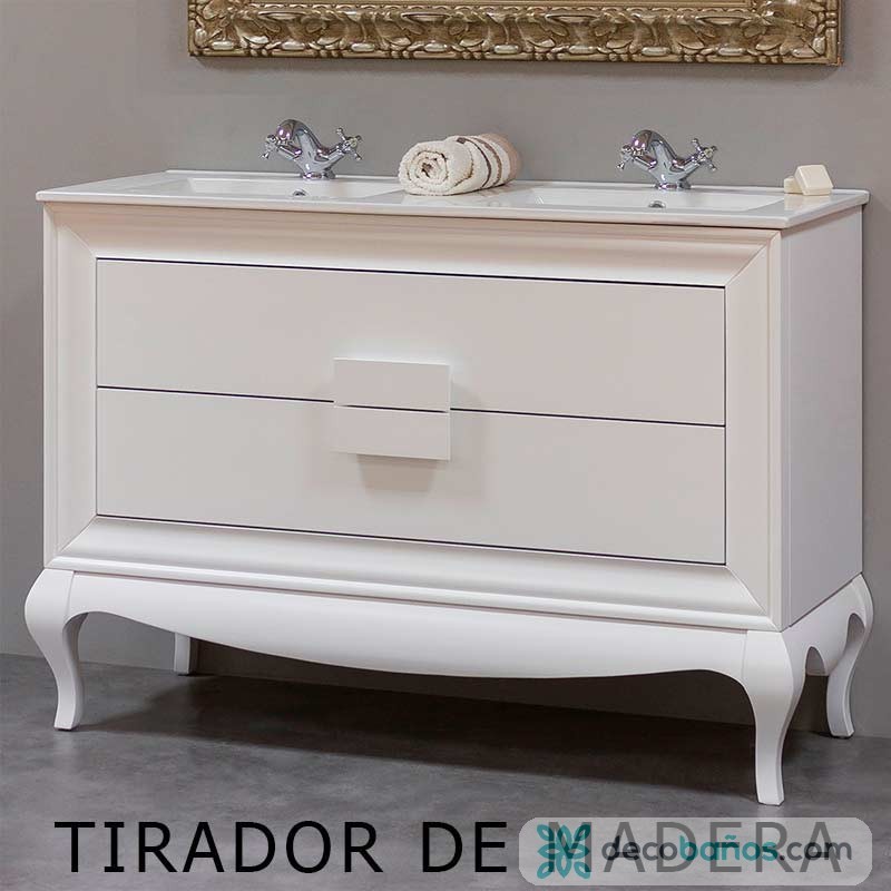 Moldura ingleteada y bancada de patas fabricadas en madera de pino pasada por secadero para evitar movimientos. Costados y frentes de cajones fabricados en tablero de densidad media (MDF) de 19 mm. Cajones con guías metalicas de cierre progresivo y extracción total de gran calidad. Lavabo de cerámica blanca de fácil mantenimiento.