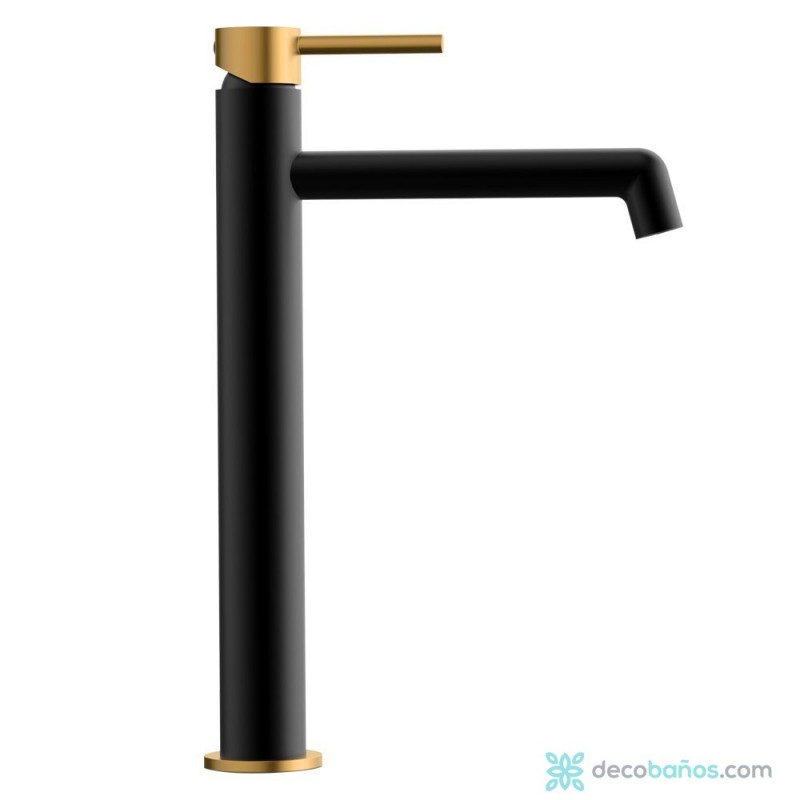 Monomando alto de lavabo con acabado negro mate con maneta en oro, con cartucho cerámico de marca española. incluye: latiguillos de acero inoxidable, herrajes de instalación de latón, filtro economizador.