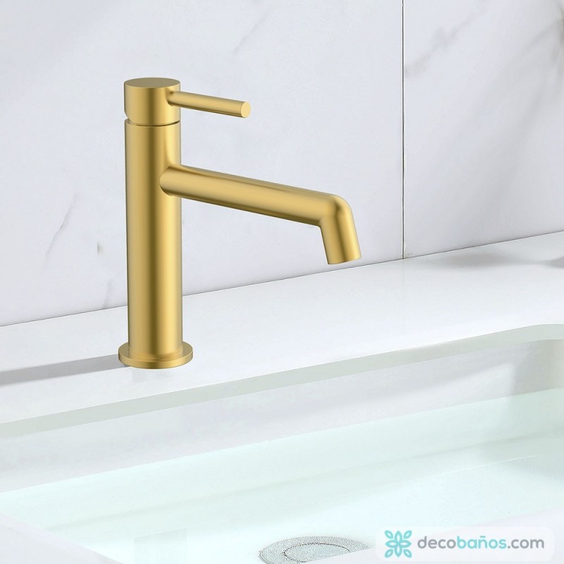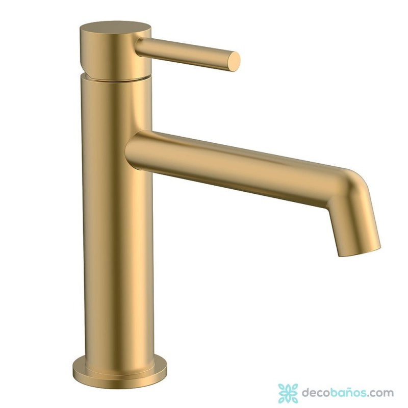 Monomando alto de lavabo con acabado oro cepillado, con cartucho cerámico de marca española. incluye: latiguillos de acero inoxidable, herrajes de instalación de latón, filtro economizador.