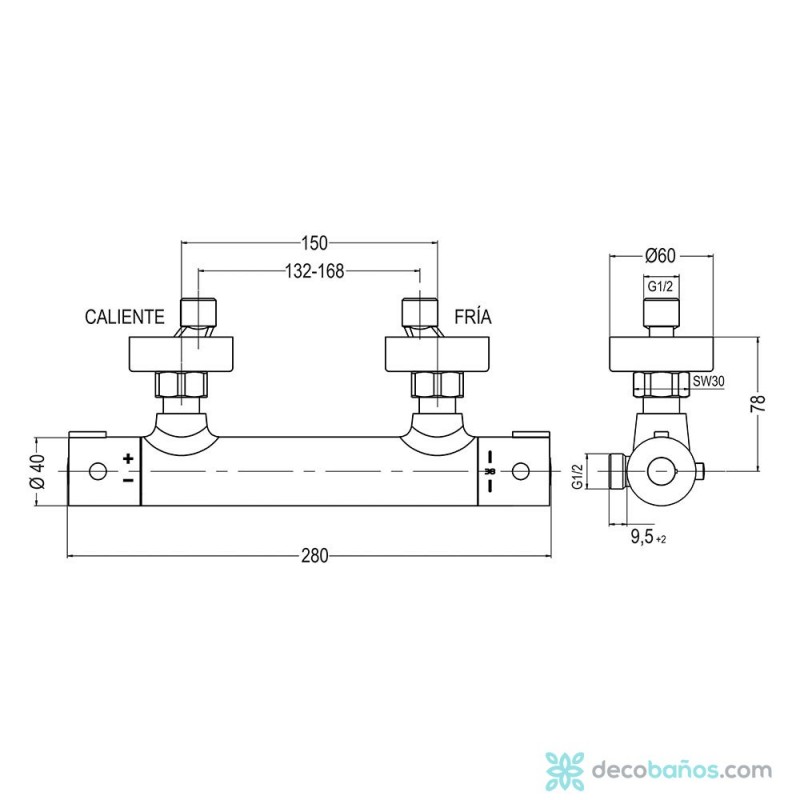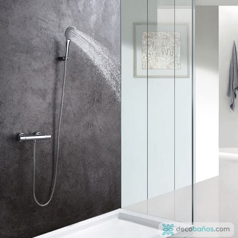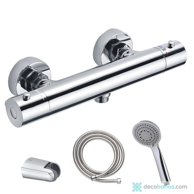 Grifo termostático para ducha PARÍS con equipo y manetas de zinc. Incluye flexo de acero inoxidable, mango de ducha y soporte de ducha. Griferia termostática. termostático de ducha con botón de seguridad. maneta con indicador de temperatura en color. Manetas metálicas de latón y válvulas antirretorno. Con flexo, maneral y barra.