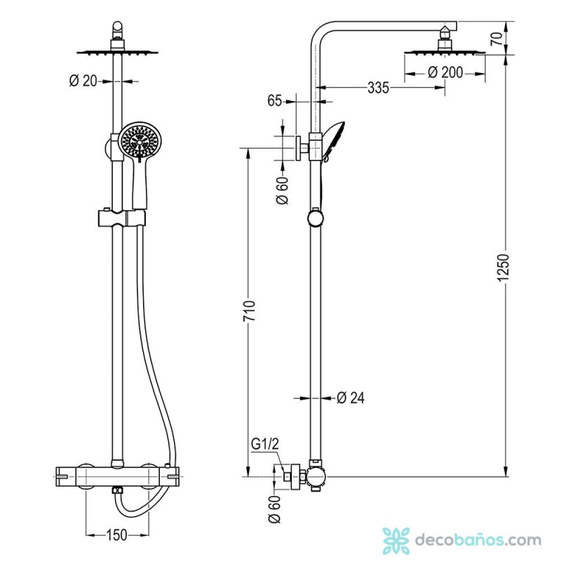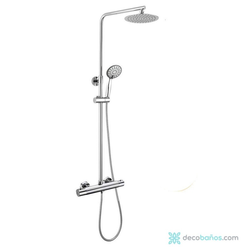 Columna de ducha con tubo redondo extensible de 80 a 120 cm. y grifería termostática con desviador integrado. Ducha de mano para hidromasaje y rociador superior redondos.